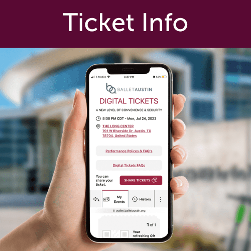 For more information regarding these accommodations or to reserve tickets in accessible seating locations, contact the Ballet Austin’s Ticketing Services Team at 512.476.2163 (Mon. – Fri. 12 p.m. – 5 p.m.) or email boxoffice@balletaustin.org.